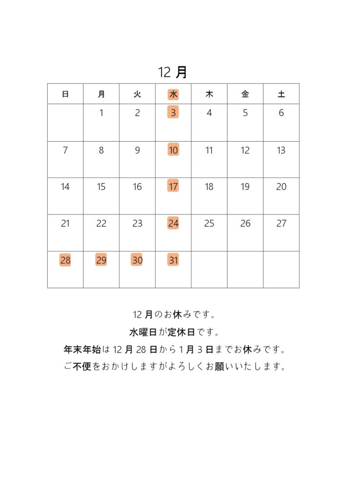 ロータス倉本 釜石店 2025.11.25 12月のお休み オイル交換に本気!ロータス倉本釜石店です。 ロータス倉本では半年、又は4,000kmでのオイル交換を推奨しております。 そこまで走っていない場合でもオイルは酸化するため定期的に交換しましょう! 12月のお休みです。 水曜日が定休日です。年末年始は12月28日から1月3日までお休みです。 ご不便をおかけしますがよろしくお願いいたします。