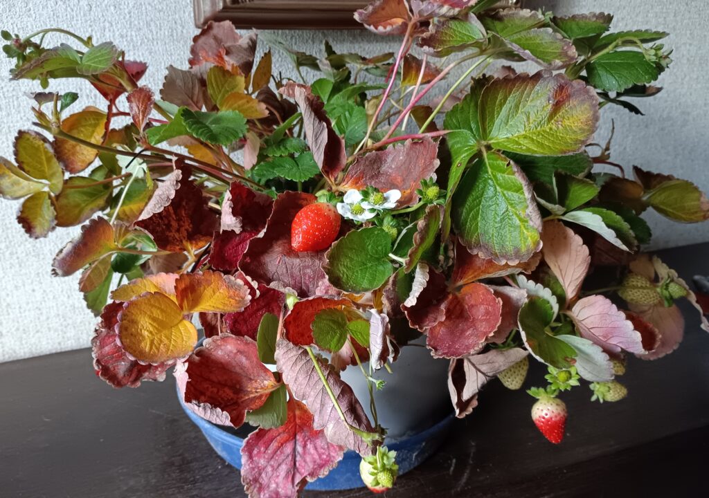前々回イチゴの写真を載せたんですが、今回はその続きです!今この時期我が家では朝、氷点下になるんですがなんとイチゴさんは強いんです。花果実が出来てます。それに葉っぱは緑、黄、赤となんとも不思議な色合わせ。このイチゴのように強く生きたいものですね。でも玄関に置くのは悪いみたいなので他に移しました。
