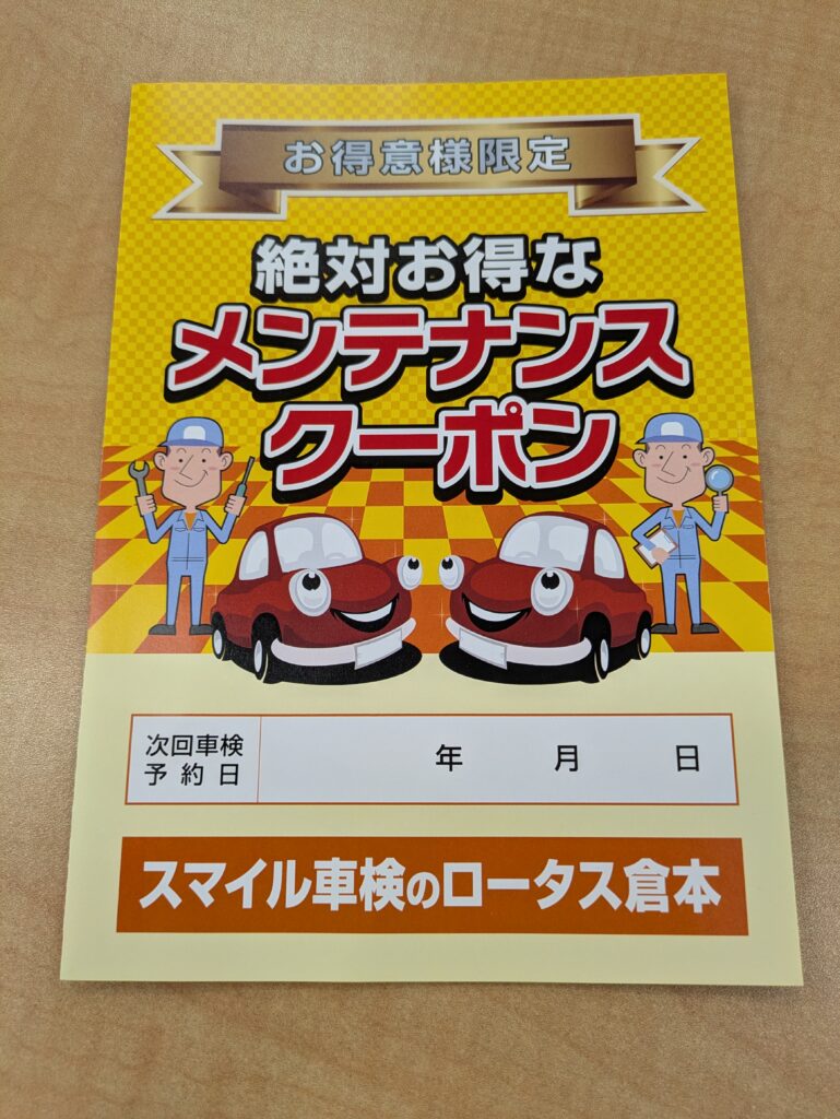 ちなみに、当店で車検を受けていただき、2年後の車検もご予約いただいた方には「絶対お得なメンテナンスクーポン券」をお渡ししております。次の車検までオイル交換工賃無料やタイヤ交換割引などのサービスがありますので、ぜひご活用ください!