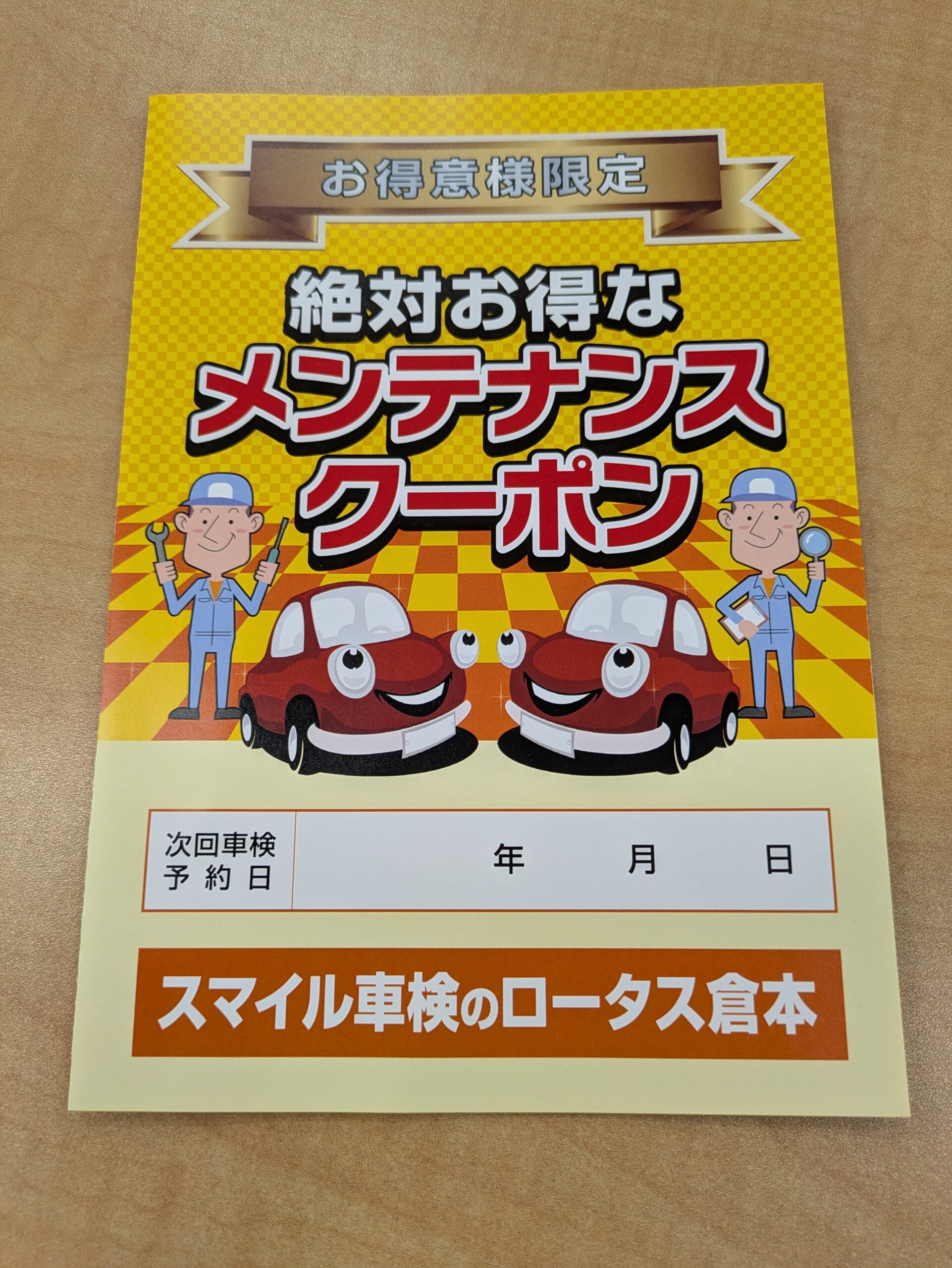 ちなみに、当店で車検を受けていただき、2年後の車検もご予約いただいた方には「絶対お得なメンテナンスクーポン券」をお渡ししております。次の車検までオイル交換工賃無料やタイヤ交換割引などのサービスがありますので、ぜひご活用ください!