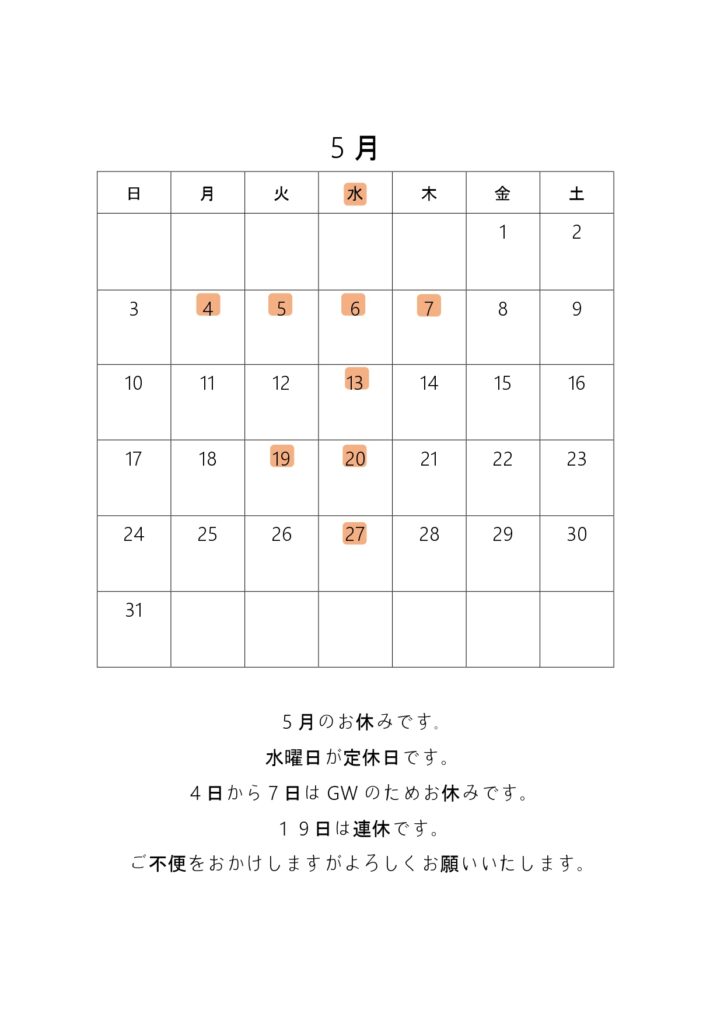 4日から7日はゴールデンウィークのためお休みです。19日20日は連休です。水曜日が定休日です。