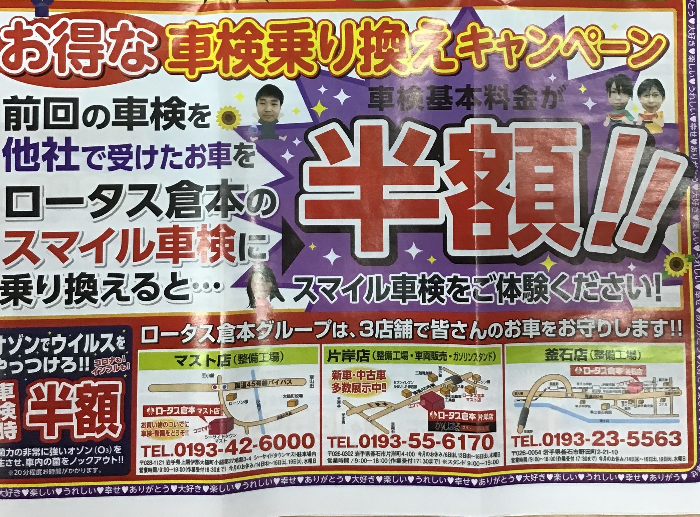 現在、ロータス倉本で車検を受けたことがないお車を車検ご入庫していただくと、基本料金半額キャンペーンを実施中です。基本料金から17,000~20,000円(軽自動車~大型乗用車)程割引になるほか、ご紹介カードをお持ちいただくとさらに5,000円お安くなります。